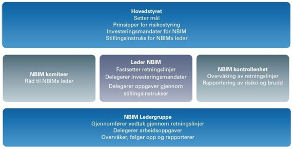 Finansdepartementets krav til forvaltningen vil være hensyntatt i disse fire dokumentene. Noen av kravene vil det være naturlig å ta direkte inn i de styrende dokumenter, mens andre krav er oppfylt ved at hovedstyret selv har fastsatt rammer. I noen tilfeller har hovedstyret delegert til leder for NBIM å fastsette nærmere rammer og bestemmelser. Vedlagte figur viser styringsmodellen for NBIMs virksomhet. Vi viser også til vår omtale av styringsmodellen i brevet av 21. oktober 2009 i forbindelse med departementets offentlige høring om nye regler for forvaltningen av fondet.